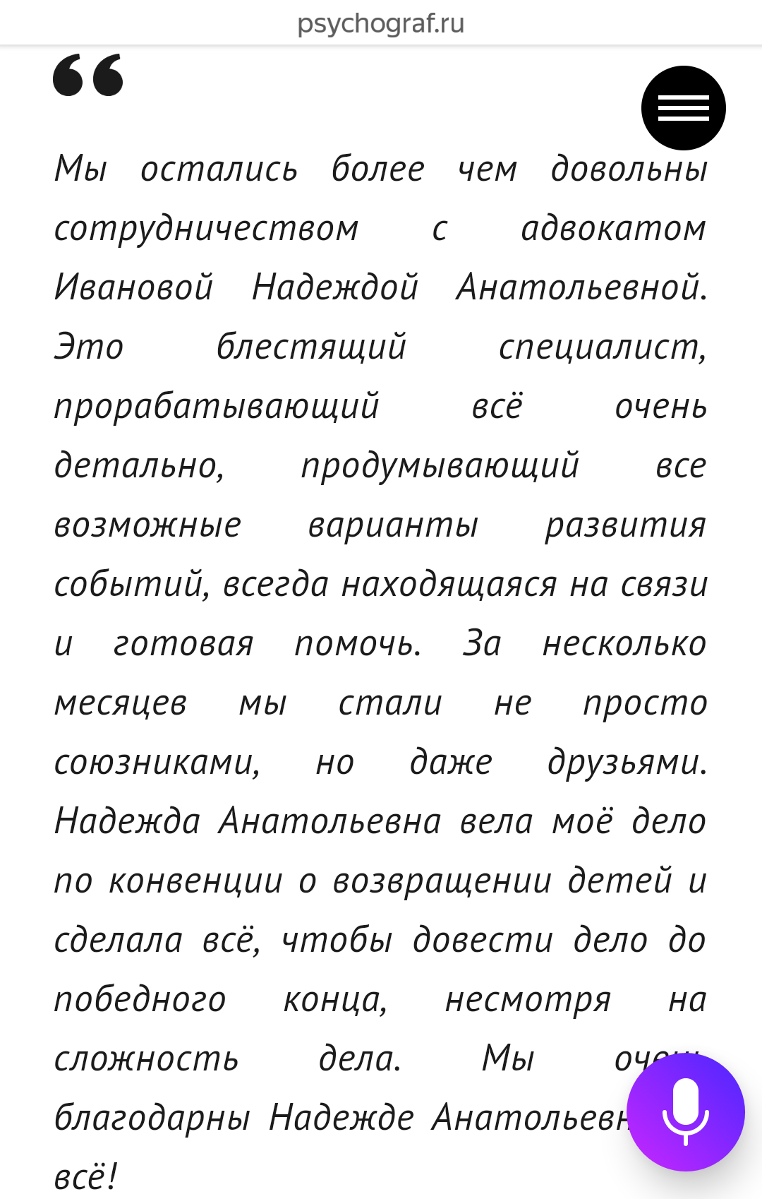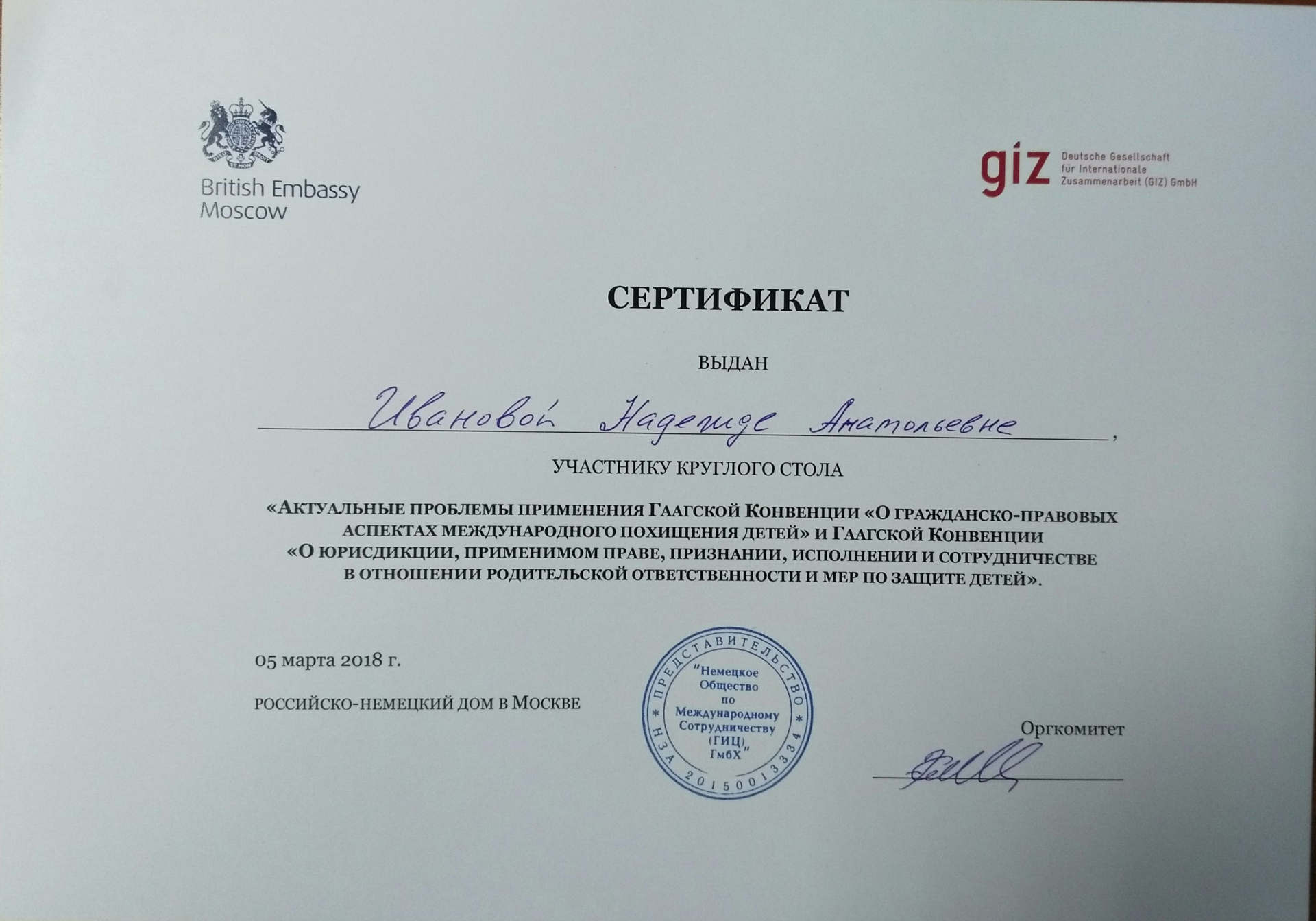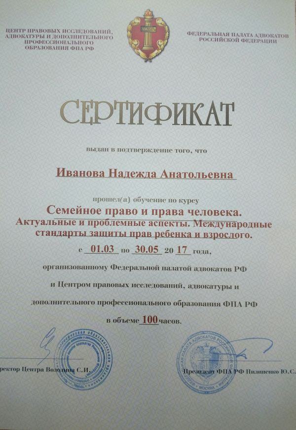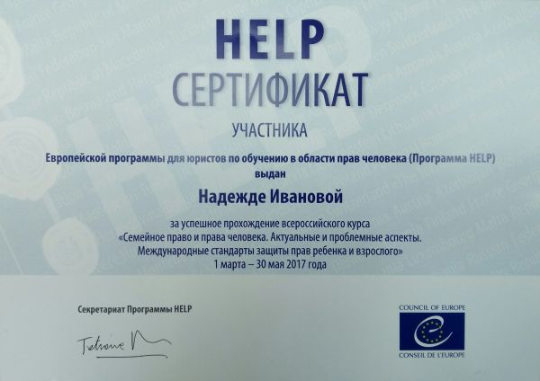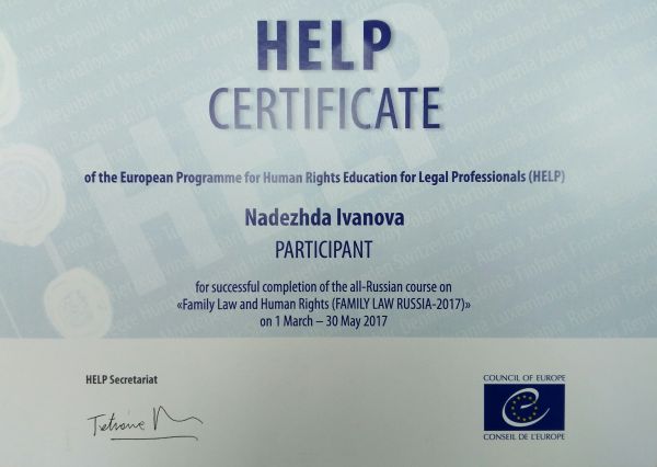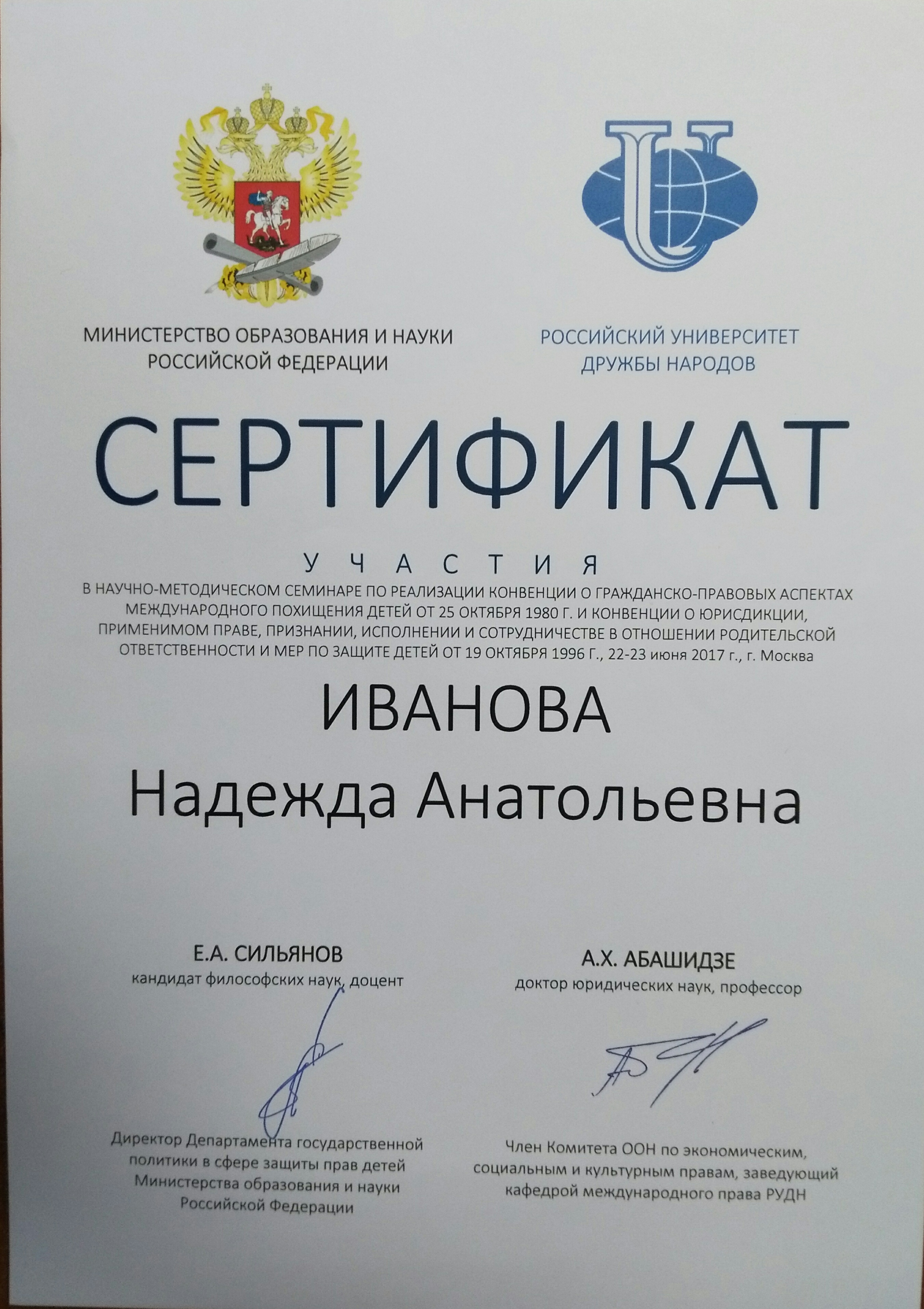 Указанные сертификаты свидетельствуют о том, что адвокат Иванова Н.А. прошла специальную подготовку и стажировку по программе Совета Европы по работе с делами о международном похищении детей и квалифицированно оказывает юридическую помощь как оставленным родителям, так и родителям - похитителям*